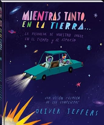 Meanwhile, Back on Earth tells the story of humanity from a cosmic perspective. Following Here We Are and What We'll Build, Oliver Jeffers presents an impressive picture book that offers his unique vision of our place in space. A father, along with his son and daughter, embarks on an exciting journey into space, from which they reflect on the conflicts that have marked Earth's history from its beginnings. They do so in a fascinating way: they convert the distance between Earth and other planets into years, and look back in time to observe what was happening on Earth then. A brief history of the world and a concise guide to the universe with an enduring message: what unites us is more important than what divides us. All told with Oliver Jeffers' unmistakable perspective, wit, and exquisite art.