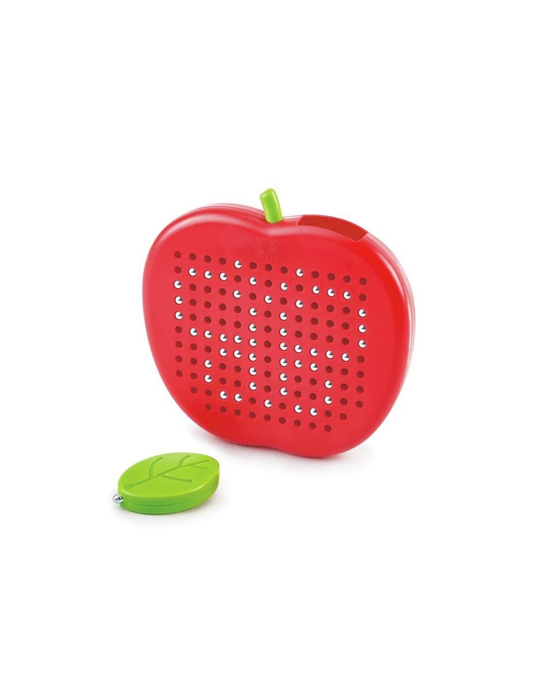 This board is adorable; it's magnetic and apple-shaped. It's very entertaining for creating beautiful shapes with the magical leaf-shaped marker. It's very simple to use: with the marker, you'll draw over the holes, and to start over, you just have to touch the ball.