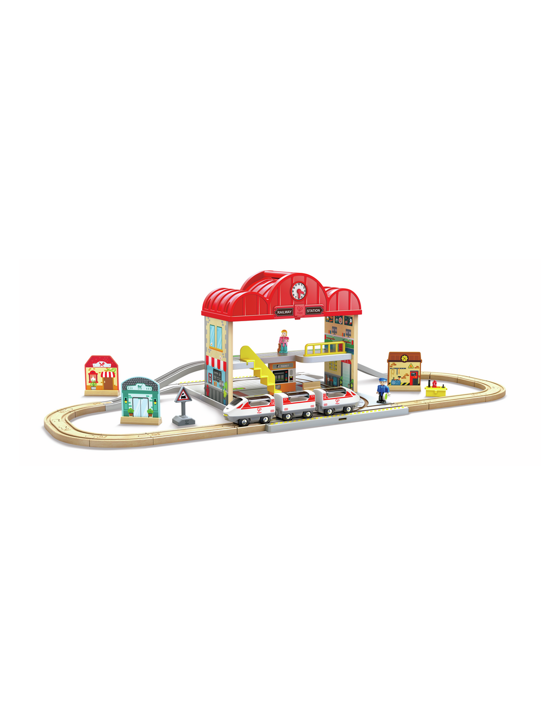El conjunto incluye una estación de tren de madera de gran calidad, vías y un tren deslizante con el que los niños pueden diseñar y reorganizar sus propios recorridos. Gracias a su formato portátil, resulta ideal tanto para jugar en casa como para llevarlo de viaje o compartirlo en casa de amigos y familiares.