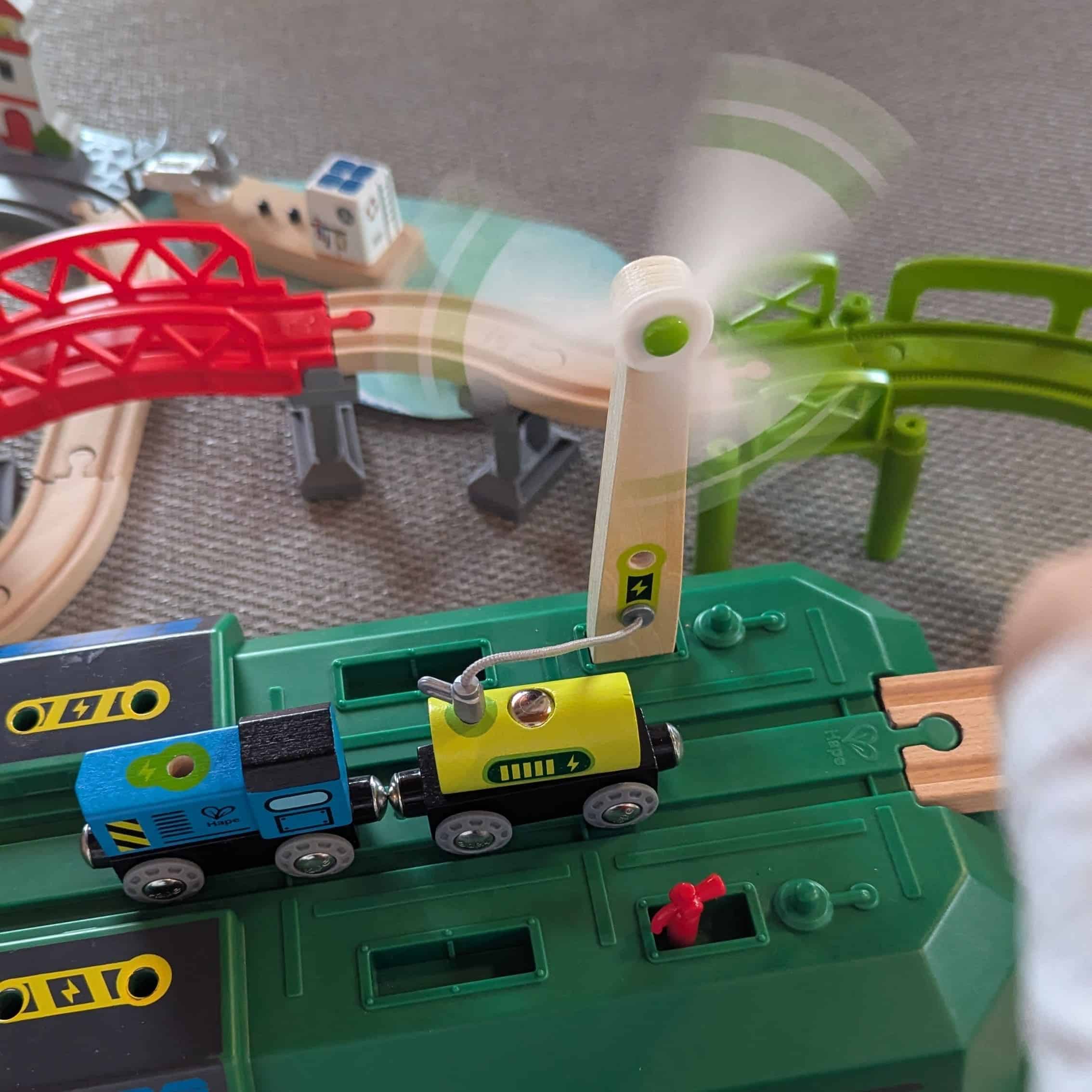 Compatible con otros sistemas de trenes de madera, este conjunto invita a descubrir la energía solar y eólica a través del juego simbólico, favoreciendo la imaginación, la coordinación y una primera aproximación a los conceptos STEM.