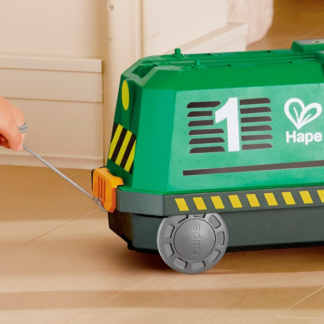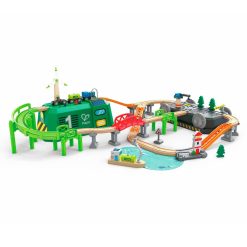 Incluye una caja–maletín con forma de tren y ruedas integradas que facilita el transporte y el almacenamiento. En su interior cuenta con un circuito completo de vías, una grúa, un barco y una estación de carga alimentada por energía solar para mover y recargar la mercancía sostenible.