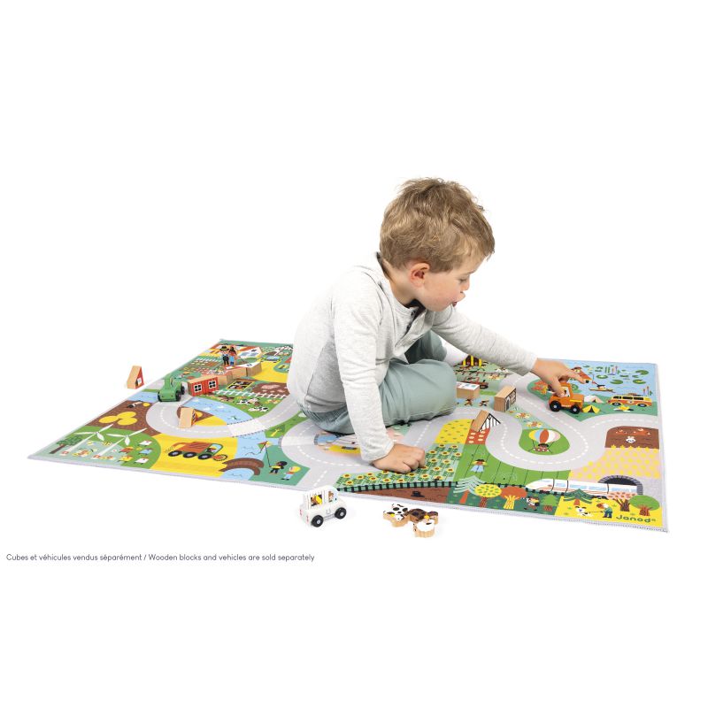 ¡Que empiece nuestra estancia en el campo! Empezamos regando el huerto, antes de ir a ayudar al pastor a vigilar a sus ovejas. Y, para terminar, daremos un paseo a caballo por la tarde y puede que durmamos en la tienda de campaña esta noche. Recorrer las carreteras rurales es ideal para inventarse un montón de historias en la granja, el bosque o el centro ecuestre. Esta alfombra es ideal para estimular la imaginación. También es un enorme juego educativo y de buscar y encontrar. ¿Encuentras al lobo que se oculta en el bosque? Gracias al mundo del campo, el niño aprenderá el nombre de los animales y sus crías, además de los números y los colores. Un extra: ¡la alfombra es antideslizante! Así el pequeño puede jugar fácilmente y con total seguridad con sus cochecitos. Juguete de imitación para niños a partir de 2 años. Puedes completar tu alfombra con una bonita colección de vehículos y bloques de madera que encontrarás en la gama Janod. ¡Y también puedes combinarla con las demás alfombras de la colección para crear un espacio de juego gigantesco!