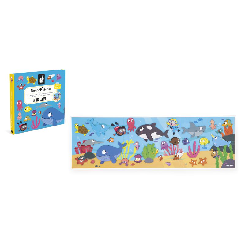 ¡Bienvenido al mundo submarino! Sumérgete en el descubrimiento de los habitantes del fondo marino, desde el delfín bromista hasta la estrella curiosa, ¡todos esperan a su hijo para vivir nuevas aventuras! Gracias al gran adorno magnético y a sus 30 imanes que representan peces y conchas, su hijo podrá imaginar muchas historias del mundo acuático. Juguete magnético de cartón FSCTM para niños a partir de 3 años.